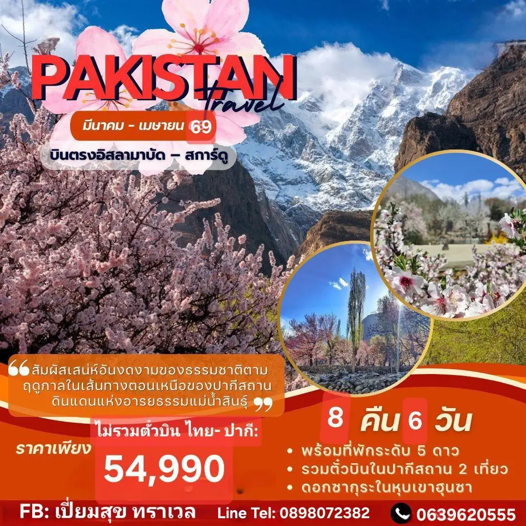 สัมผัสเสน่ห์อันงดงามของธรรมชาติฤดูการดอกไม้ผลิบานของเส้นทางตอนเหนือปากีสถาน ดินแดนแห่งอารยธรรมแม่น้ำสินธุ์ ” ที่พักดี ดาว อาหารดี รวมบินในประเทศปากีสถาน 2 เที่ยวบิน เส้นทางสบายๆ ไม่เหนื่อย โปรแกรม คุณภาพ ราคาสุดคุ้ม ” <br><br>อิสลามาบัด – สการ์ดู -ชีการ์ – ฮุนซ่า – คาริมาบัด – ดุยเกอร์ – พาสสุ – ทะเลสาบอัตตาบัด – โฮเปอร์ – กิลกิต<br>